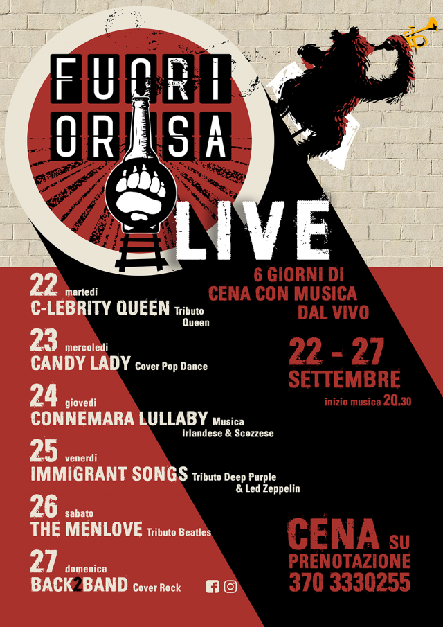 Cena con concerto ogni sera dal 22 al 27 settembre dalle 20:30 al Fuori Orsa nel Parco del DLF. Band che spaziano tra generi musicali che nessuno aveva mai osato mettere insieme, dal rock alla dance, dal beat pop inglese anni 60 al folk irlandese. Un palco variopinto per salutarvi e ringraziarvi per questa fantastica stagione estiva. Lo faremo insieme a C-lebrity Queen, Candy Lady, Connemaralullaby, Immigrant Songs, The Menlove, Back2Band.